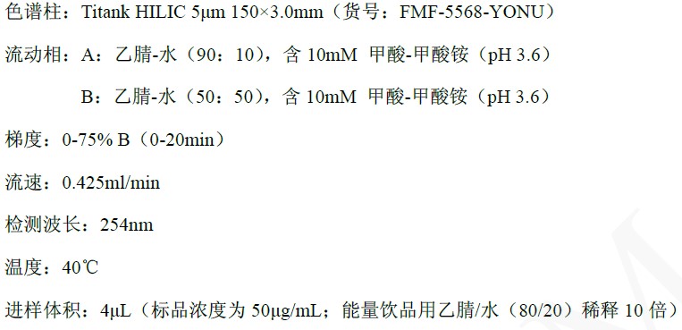 國標(biāo)中用的UPLC的酰胺基柱(1.7u,150*3.0mm)或者HPLC的Si 60硅膠柱(5u,250*4.6mm),以適配不同實(shí)驗(yàn)室的儀器條件。