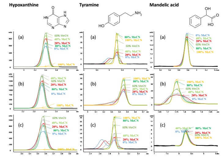 次黃嘌呤(極性中性)的峰形一般隨著乙腈濃度的增加而改善,最佳的有機(jī)溶劑含量在60-80%左右。酪胺(堿性)在低百分比有機(jī)相稀釋劑條件下,HILIC-B和HILIC-N上出現(xiàn)分裂峰, HILIC-A峰形很差。當(dāng)乙腈的濃度大于60%,峰形得到顯著的改善。扁桃酸的峰形在HILIC-B和HILIC-N相上受稀釋劑的影響較小,而對于HILIC-A相,在高水濃度下峰形較差??偟膩碚f,從這個數(shù)據(jù)集合來看,對于這個應(yīng)用,樣品推薦使用由60-80%有機(jī)相組成的稀釋劑。