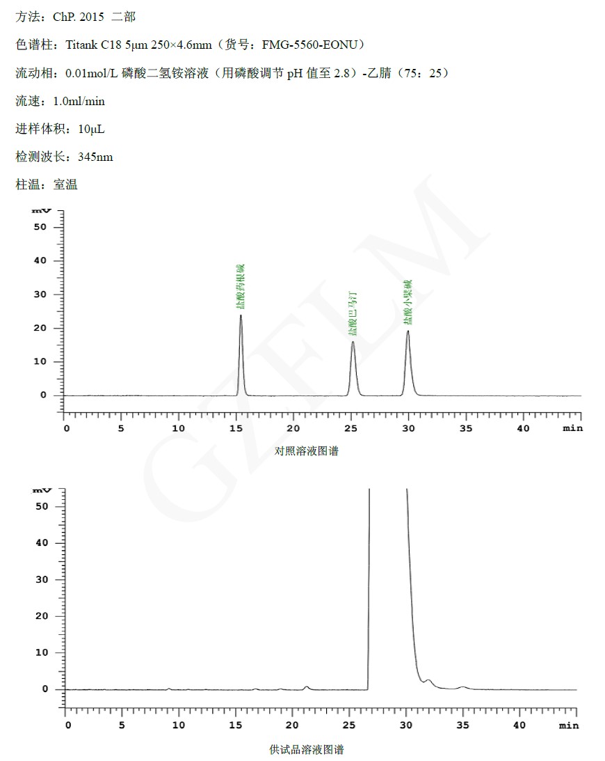 Titank C18有機(jī)硅膠雜化色譜柱,是在硅膠的硅氧網(wǎng)狀構(gòu)造中以更加穩(wěn)定的烷基來取代在堿性條件下不穩(wěn)定的硅氧橋連接,具有寬pH耐受范圍(1-12)、低背壓和100%水相穩(wěn)定的特點(diǎn),對于較大極性的物質(zhì)有很好的保留。下圖分別為幾種生物堿的分析、鹽酸小檗堿的有關(guān)物質(zhì)。