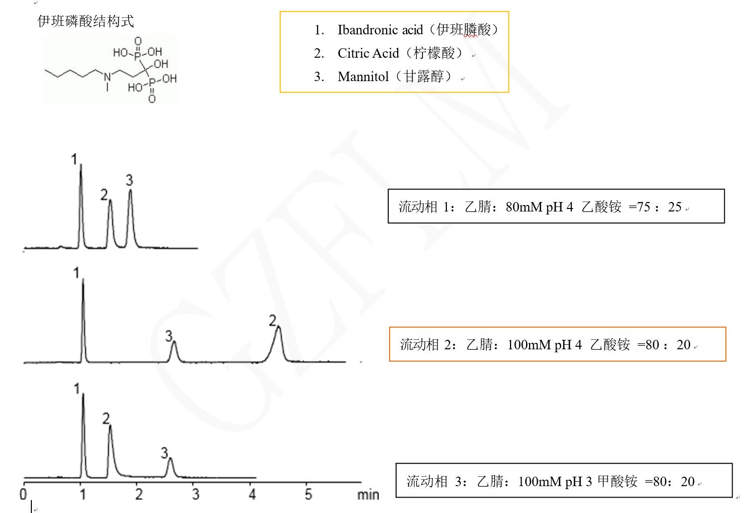 伊班磷酸, 檸檬酸與甘露醇的液相分析