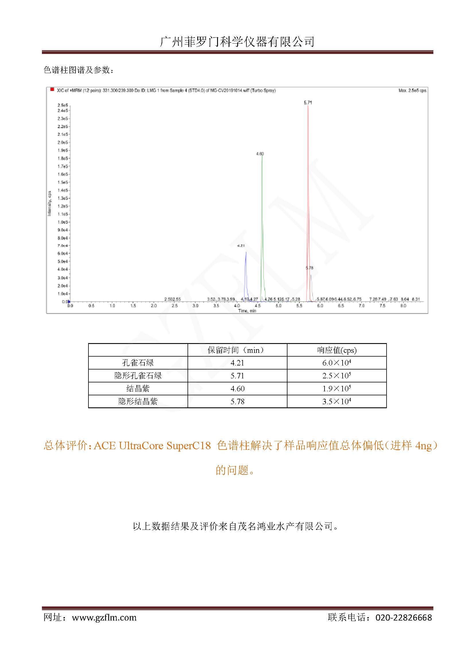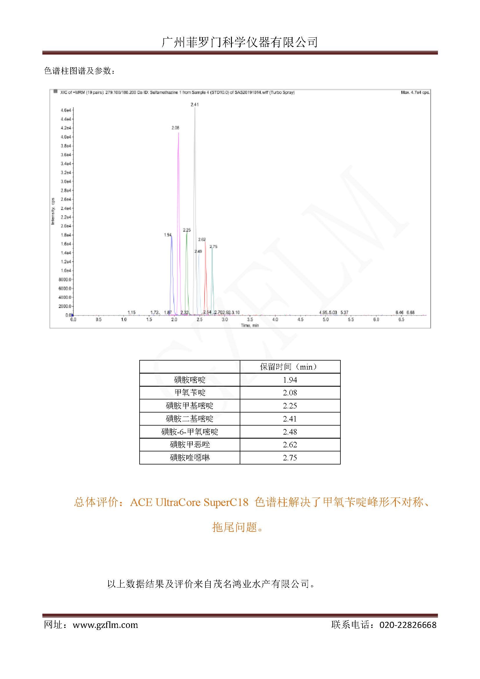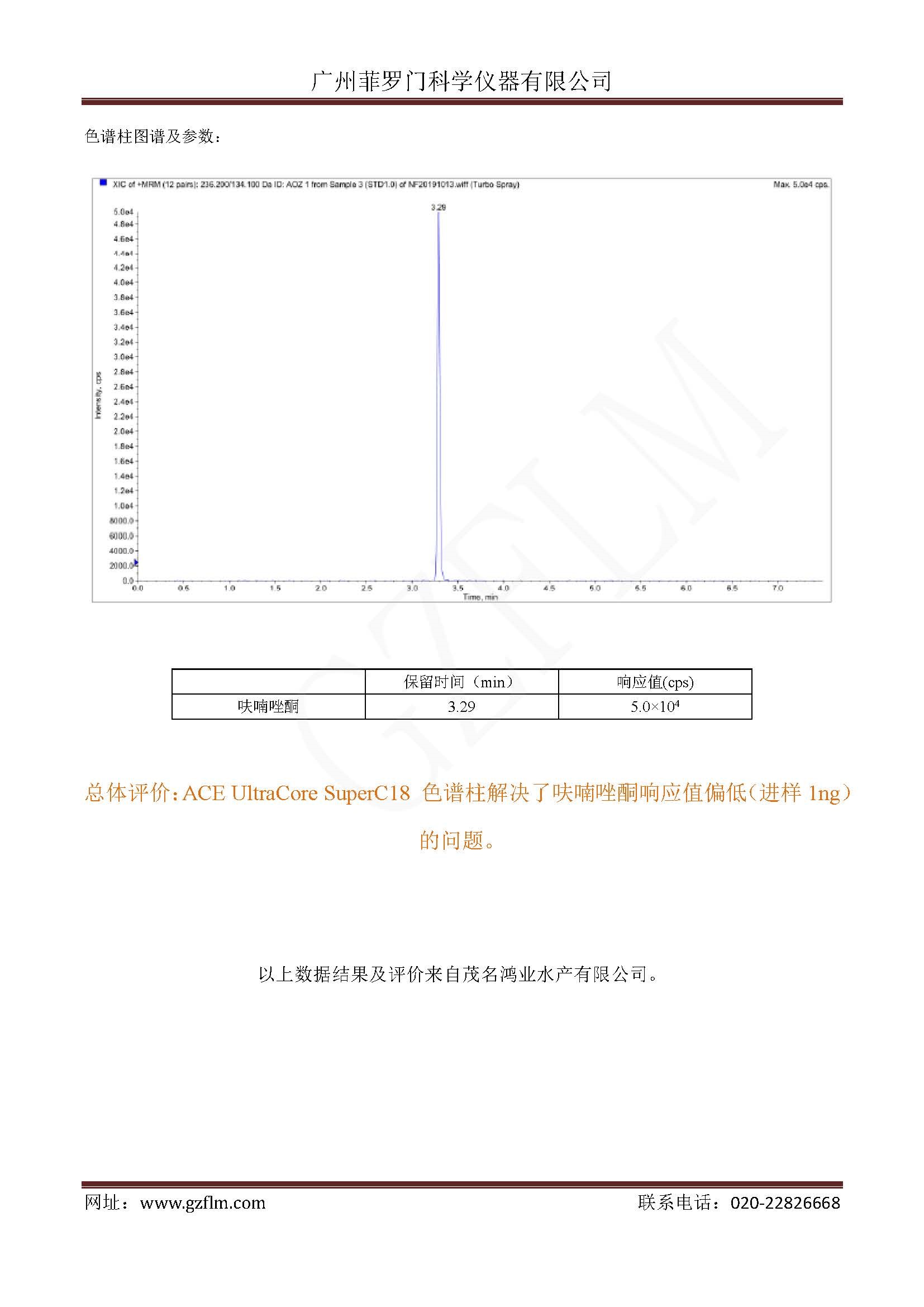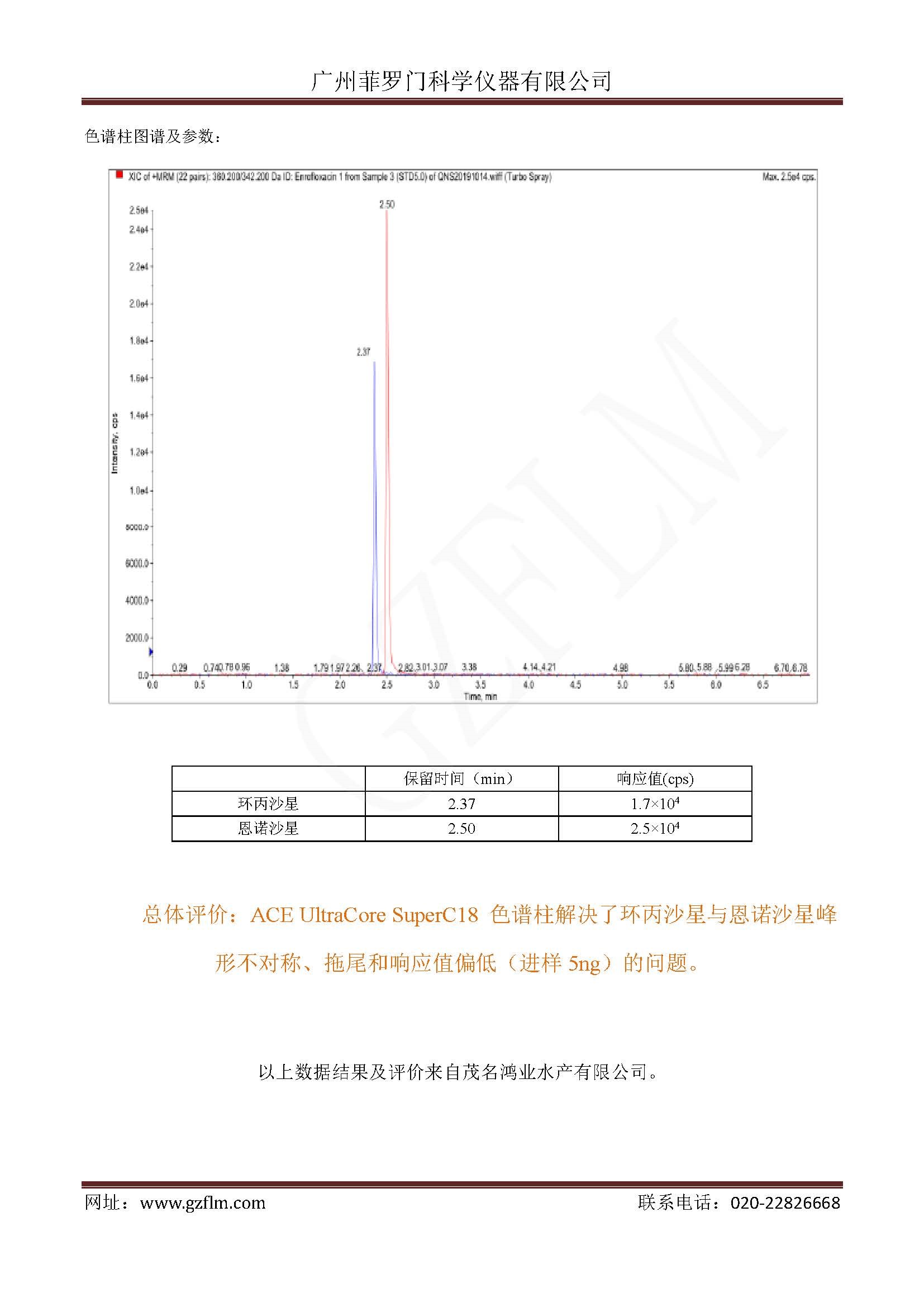 以上由ACE UltraCore Super C18 2.5u 50 X 3.0mm (貨號:CORE-25A-0503U)一根柱子在質(zhì)譜上解決硝基呋喃類、氯霉素類、磺胺類、沙星類、孔雀石綠和結晶紫水產(chǎn)品中的藥物殘留。
