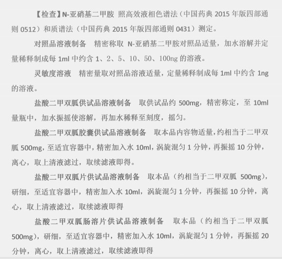 【檢查】N-亞硝基二甲胺 照高效液相色譜法(中國藥典2015年版四部通則0512)和質(zhì)譜法(中國藥典2015年版四部通則0431)測定。