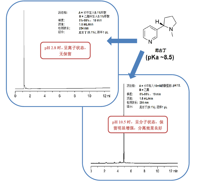 我們知道,分子的離子狀態(tài)由流動相的pH決定,因此,調(diào)整流動相 pH 能夠有效調(diào)節(jié)具有電離官能團(tuán)的分析物的保留行為。
