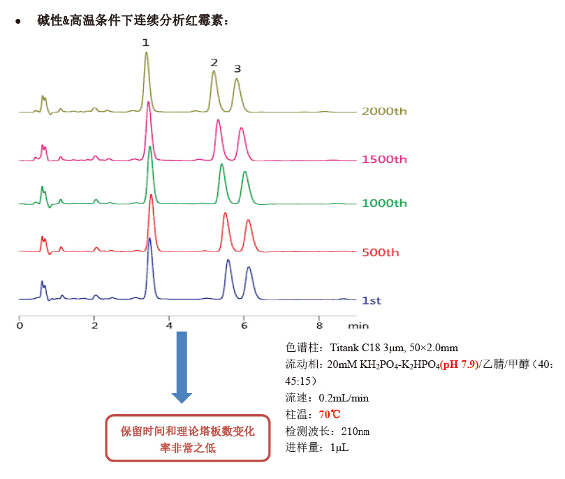 例如紅霉素,它在酸性條件下極易分解,并且需要高溫來維持良好的峰形,普通硅膠基質(zhì)色譜柱是難以耐受這種分析環(huán)境,這時(shí),就需要 Titank系列有機(jī)硅膠雜化色譜柱來解決上述分析難題。
