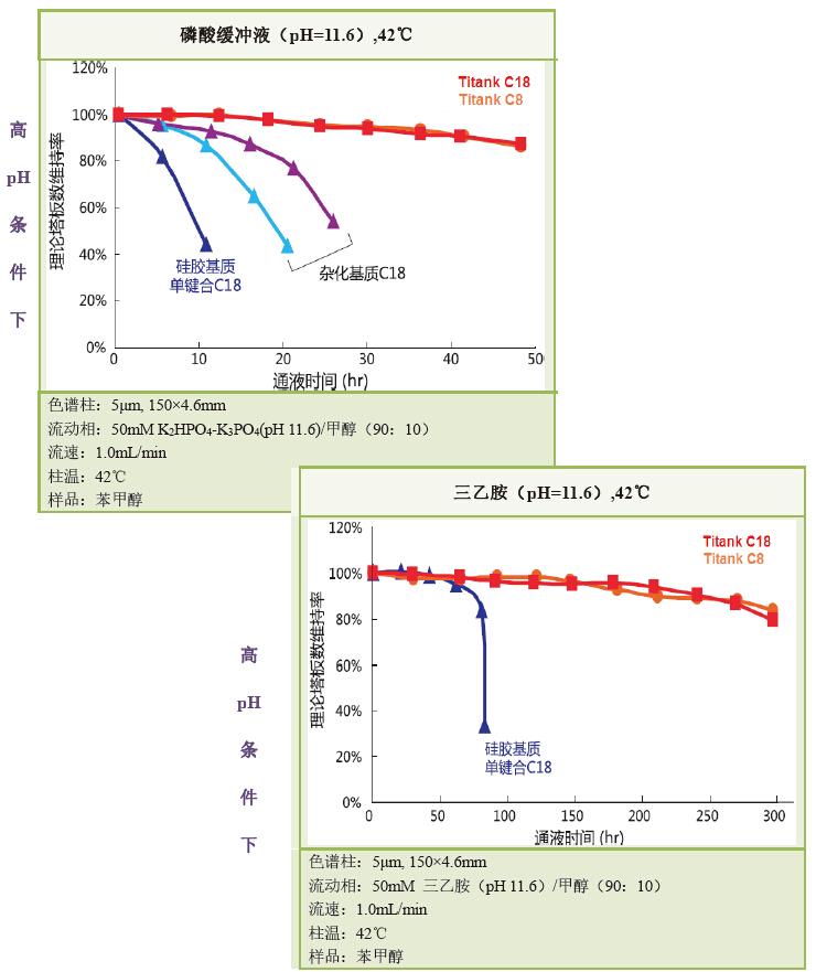 從以上兩組數(shù)據(jù)可以發(fā)現(xiàn),在強(qiáng)堿或高溫等苛刻條件下的 Titank C18/C8 的色譜柱壽命,都遠(yuǎn)在市售高耐堿性柱和普通硅膠基質(zhì)ODS柱之上。