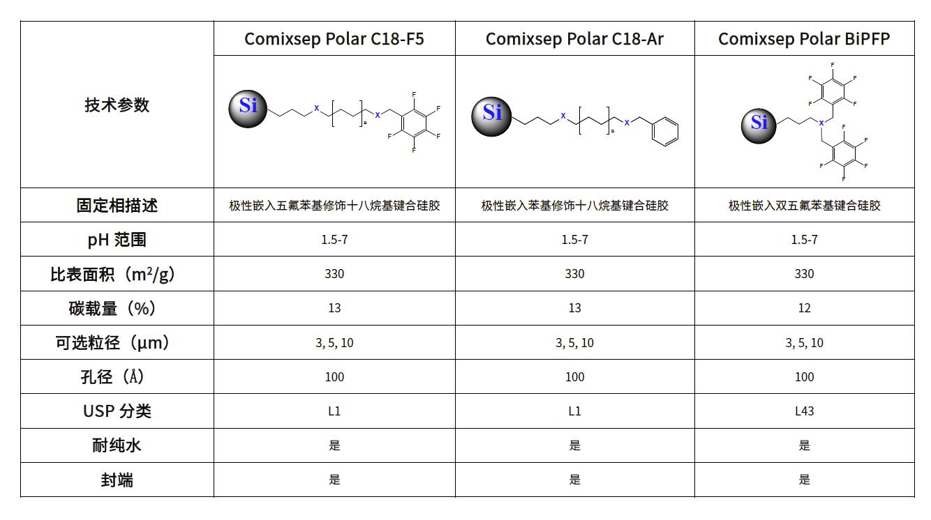 菲羅門公司的Comixsep系列為創(chuàng)新的混合作用(Mixed-mode)液相色譜柱,通過在碳鏈上嵌入極性基團(tuán)和芳香基團(tuán),使色譜柱兼具疏水作用、極性作用和π-π作用從而具有與常規(guī)C18不一樣的獨(dú)特選擇性,非常適合用于HPLC分析方法開發(fā)。