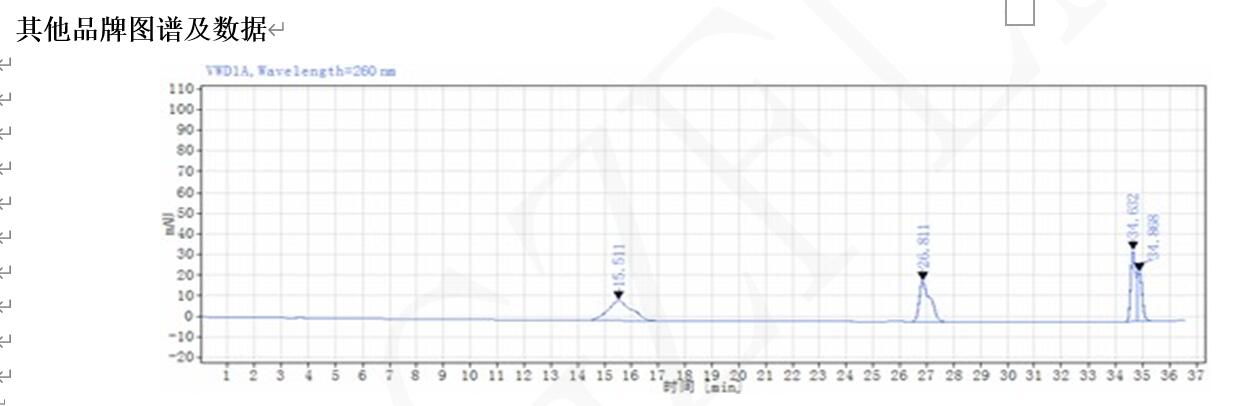 而本方法中更是使用了 100%水相 ,使用 TitankC18 與其他品牌色譜柱對(duì)比,發(fā)現(xiàn) TitankC18 色譜柱峰型及壽命 優(yōu) 于 其 他 品 牌 色 譜 柱 。 該 流 動(dòng) 相 體 系 適 合 轉(zhuǎn) 換 成 LC-MS 檢 測 。