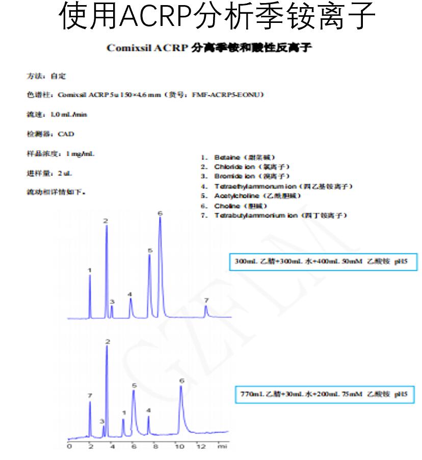 當緩沖鹽的PH用到了5,觀察第一個圖譜和條件,四丁基銨離子因為只有一個位點的陰陽離子交換,該流動相條件下幾乎沒有沒有Hilic作用,導致出峰最慢。此PH狀態(tài)下,甜菜堿具有兩個位點的電離,陰陽離子交換比較強,所以最先出峰。觀察第二個圖譜和條件,此時的流動相條件下具有Hilic作用,又因為四丁基銨離子是分析物中疏水性最強的,所以最先出峰。