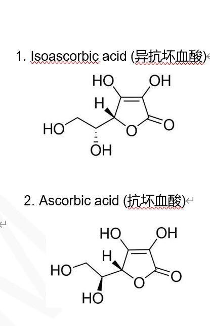 抗壞血酸與異抗壞血酸是一對光學異構體??箟难崾且环N營養(yǎng)強化劑,藥用為多。異抗壞血酸,多用于食品與化妝品中,作為防腐劑用。