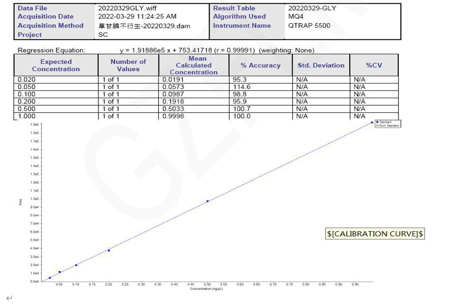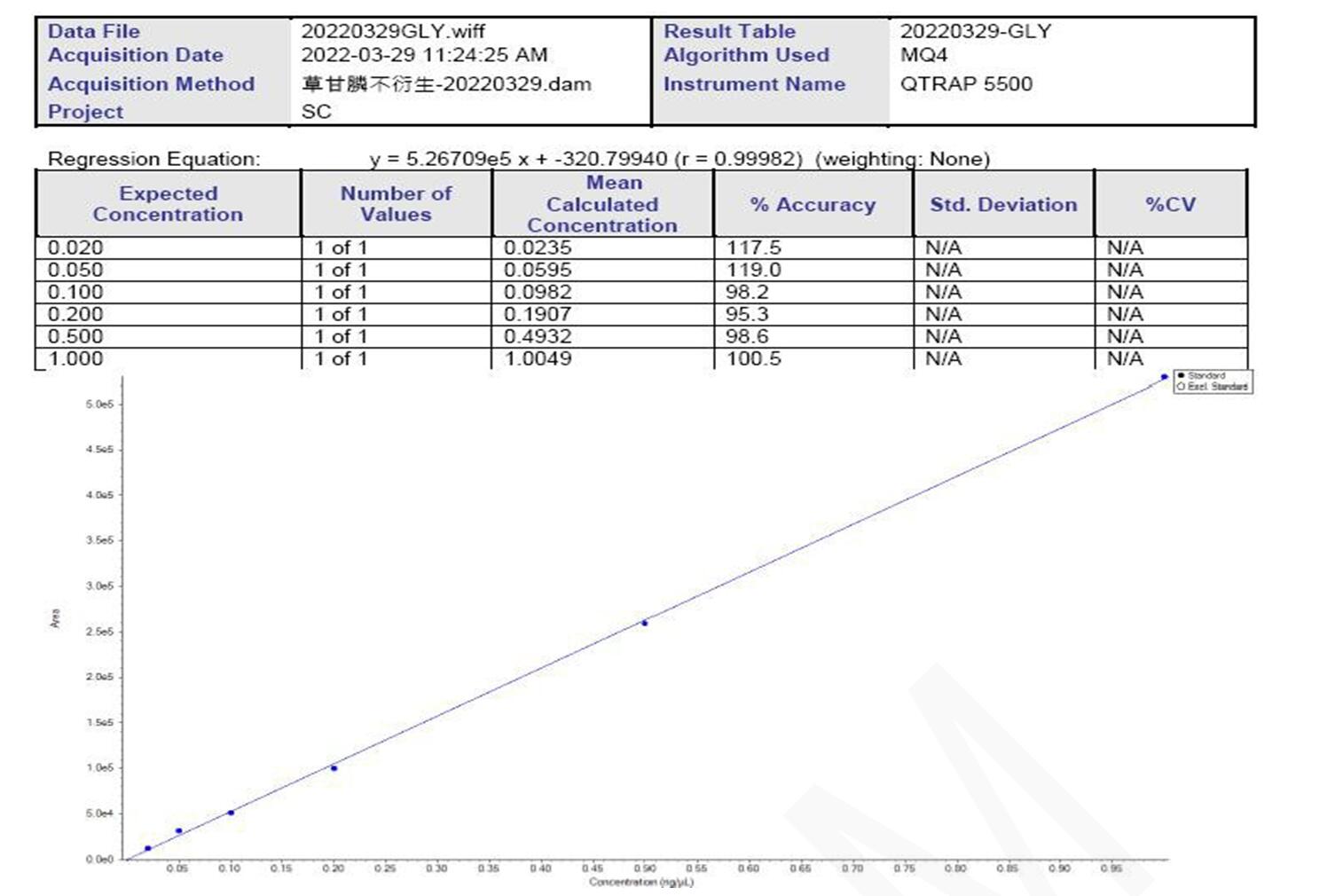 AB 質(zhì)譜儀,從 0.02 ppm 至 1 ppm 的 MS 校準曲線如下