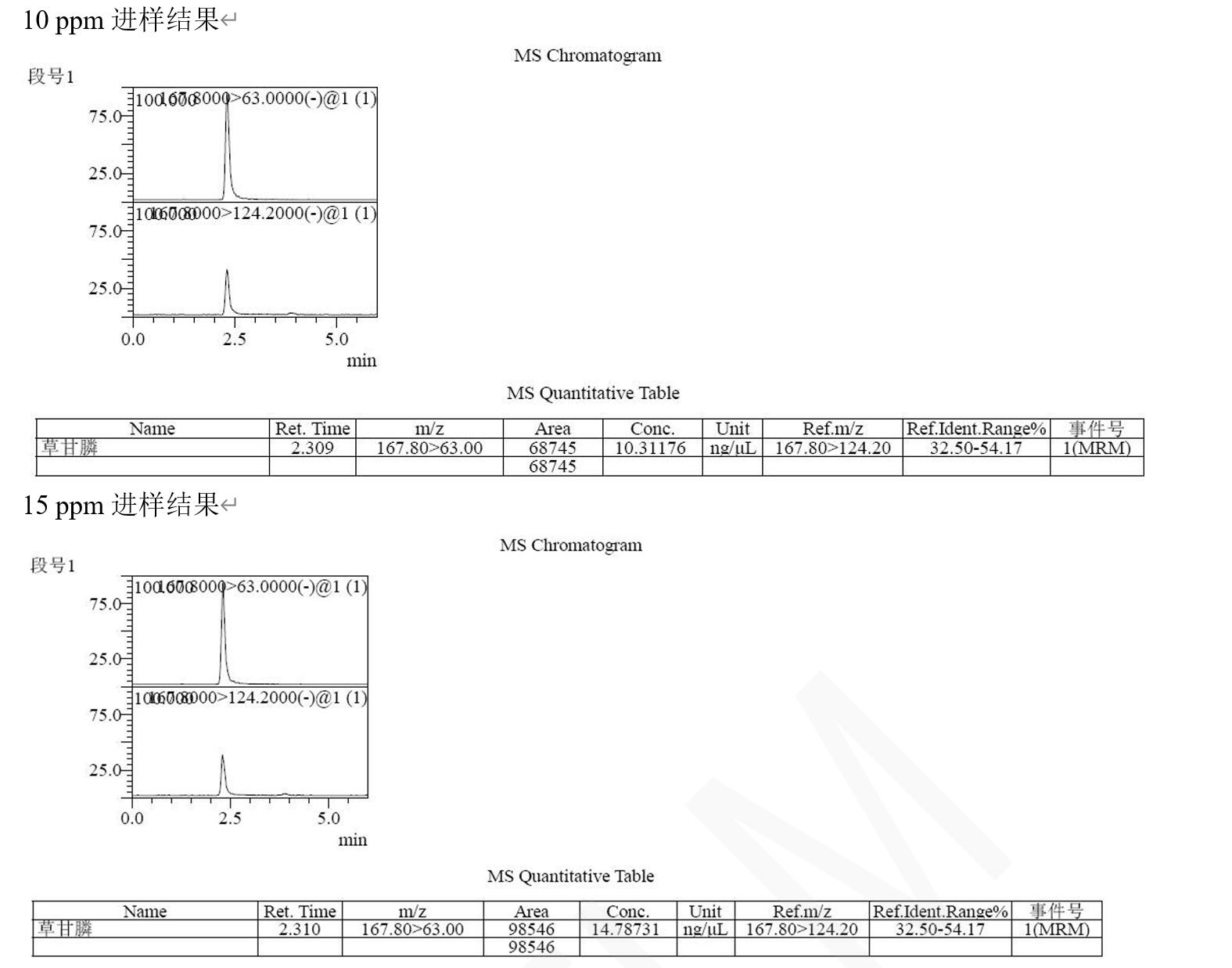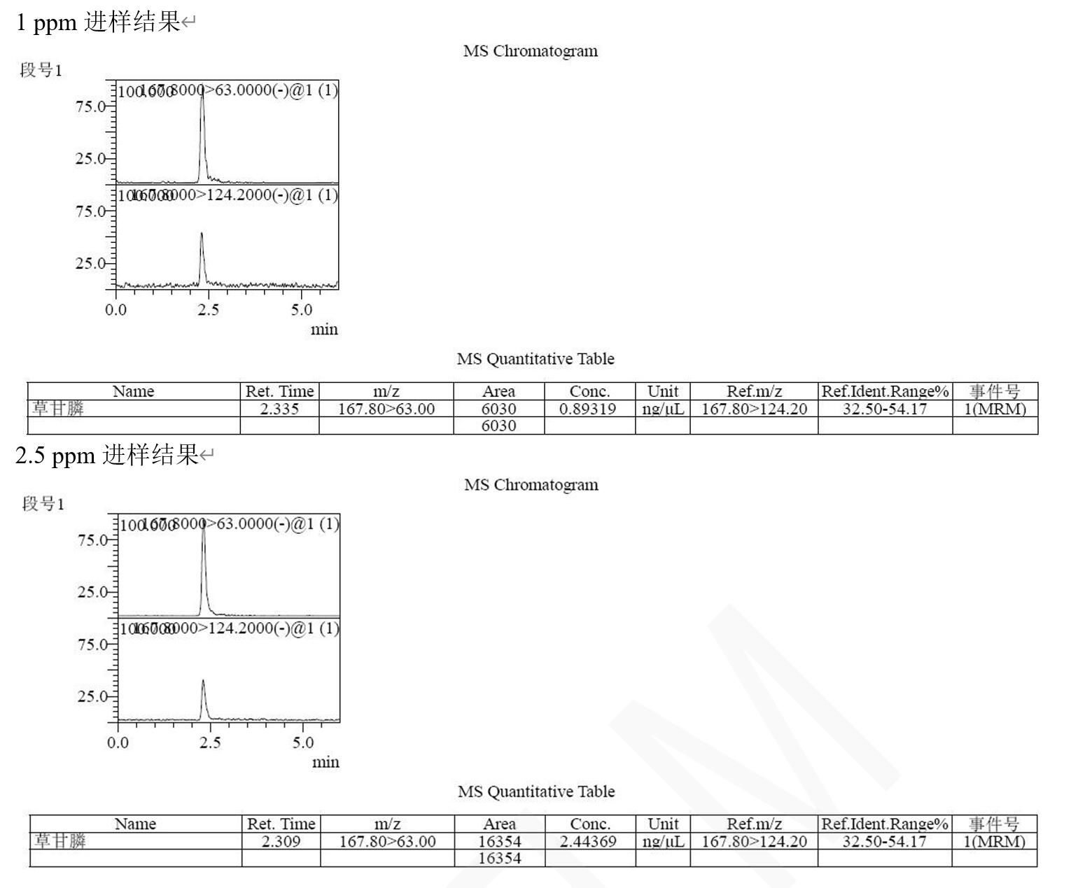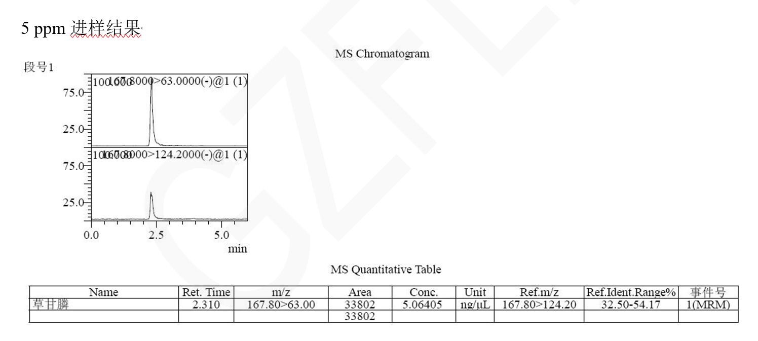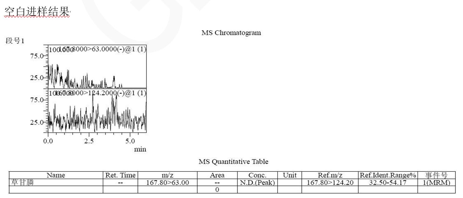 說明:本方法研究草甘膦不衍生直接檢測。相比于傳統(tǒng)衍生后用 C18 分析,或者用氨基柱不衍生 PH=10-11 條件下分析,帶來的復(fù)雜,耗時,以及氨基柱結(jié)果重現(xiàn)與壽命上的問題。此方法簡單,快速,方便??蓾M足常規(guī)分析檢測需求以及多數(shù)殘留檢測需求。