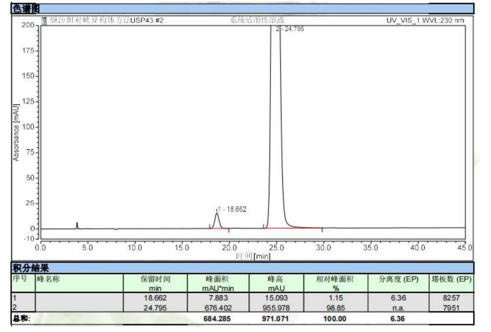App ID: FLM-B230018 纈沙坦對(duì)映異構(gòu)體的手性拆分 方法:USP 方法 色譜柱:Chiral INC 5u 250*4.6mm(貨號(hào):FMG-JY5-I03) 檢測(cè):UV 230nm 流動(dòng)相:正己烷:異丙醇:三氟乙酸=850:150:1 流速:0.8ml/min 進(jìn)樣體積:10μl 柱溫:室溫 圖譜: ![]() |