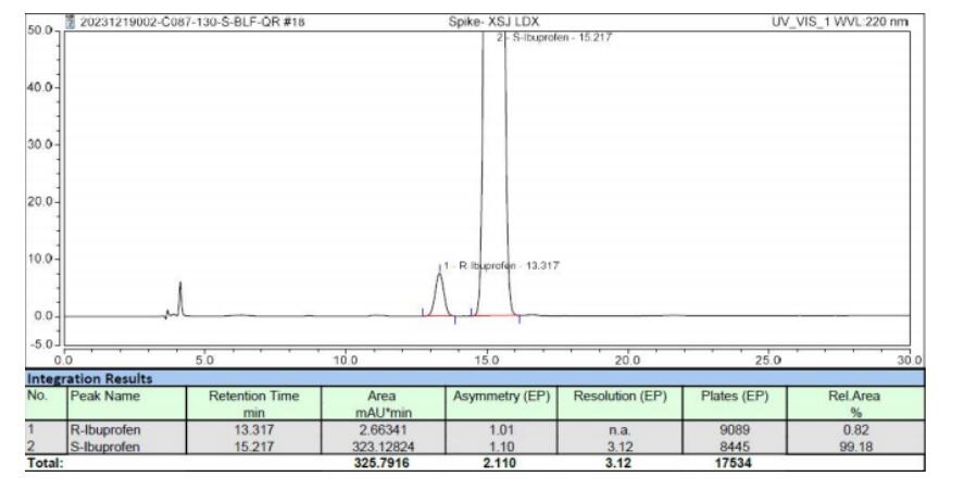 方法說明:該款反相手性色譜柱相比其它的正相方法,采用簡單的反相流動相體系,更為實(shí)用方便。峰形對稱,柱效高。藥典要求理論板數(shù)按右布洛芬峰計(jì)算不低于 2000,右布洛芬峰與左布洛芬峰之間的分離度應(yīng)大于3.0,此反相方法也完全符合藥典的指標(biāo)要求。