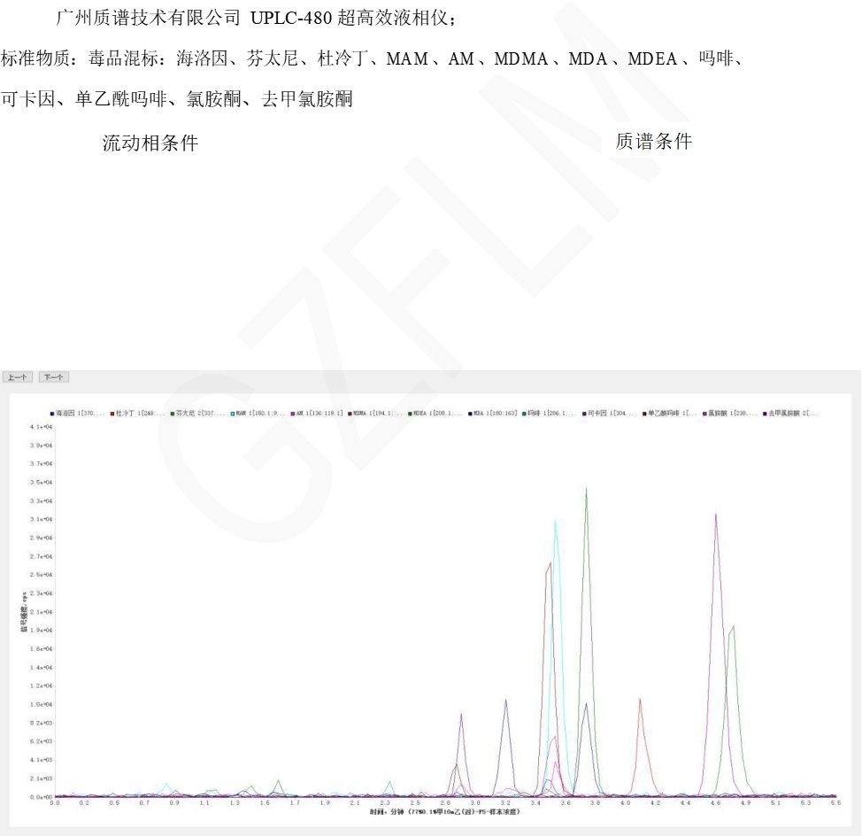 App ID:FLM-T240004 海洛因、芬太尼、杜冷丁等 13 種毒品測定 色譜柱:Titank F5 1.8u 100*2.1mm(FMD-5563-BONU) 流動相 A:0.1%甲酸水(含 5mmol/L 乙酸銨) 流動相 B:甲醇 流速:0.4ml/min 進樣體積:10μl 柱溫: 35℃ 儀器: 廣州質(zhì)譜技術(shù)有限公司 LCMS-TQ480 三重四極桿串聯(lián)質(zhì)譜儀; 廣州質(zhì)譜技術(shù)有限公司 UPLC-480 超高效液相儀; 標(biāo)準(zhǔn)物質(zhì): 毒品混標(biāo):海洛因、芬太尼、杜冷丁、MAM、AM、MDMA、MDA、MDEA、嗎啡、 可卡因、單乙酰嗎啡、氯胺酮、去甲氯胺酮 流動相條件