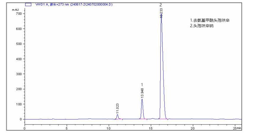 1. **系統(tǒng)適用性**: - 頭孢呋辛峰與去氨甲酰頭孢呋辛峰之間的分離度均大于**3.0**。 - 頭孢呋辛峰與后相鄰雜質(zhì)峰間的分離度均大于**2.0**。 - 這些參數(shù)均符合中國(guó)藥典的測(cè)試要求,為頭孢呋辛鈉藥物的質(zhì)量保證提供了可靠的檢測(cè)依據(jù)。