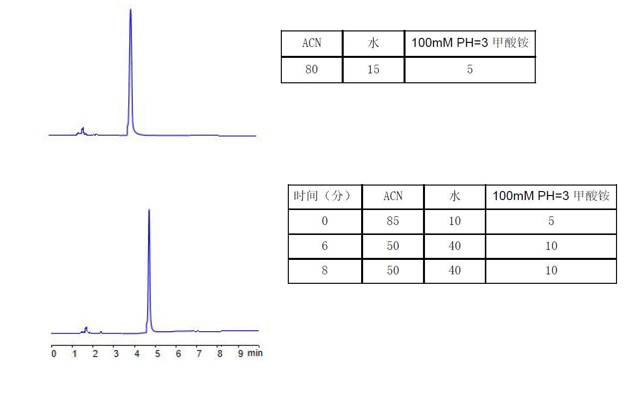 說(shuō)明:以上應(yīng)用可以簡(jiǎn)單在酸性體系下分析尼古丁。如果是用于MS 檢測(cè)器??蛇x擇Comxsil HAC 3u 50*2.1mm(P/N:FMB-HAC3-BONU)柱,0.2ml/min, ACN:5mM PH=3 甲酸銨=85:15,預(yù)計(jì)2min 出峰分析完畢。 該方法可避免C18 柱酸性條件下的弱保留,拖尾;避免Hilic 柱酸性條件下的重現(xiàn)性問(wèn)題,避免不喜歡用堿性條件的客戶群體。如果愿意用堿性體系的,菲羅門公司的Titank C18 柱,ACN 與碳酸氫銨的體系,也可以很好分析尼古丁,可向銷售代表索取應(yīng)用。 |