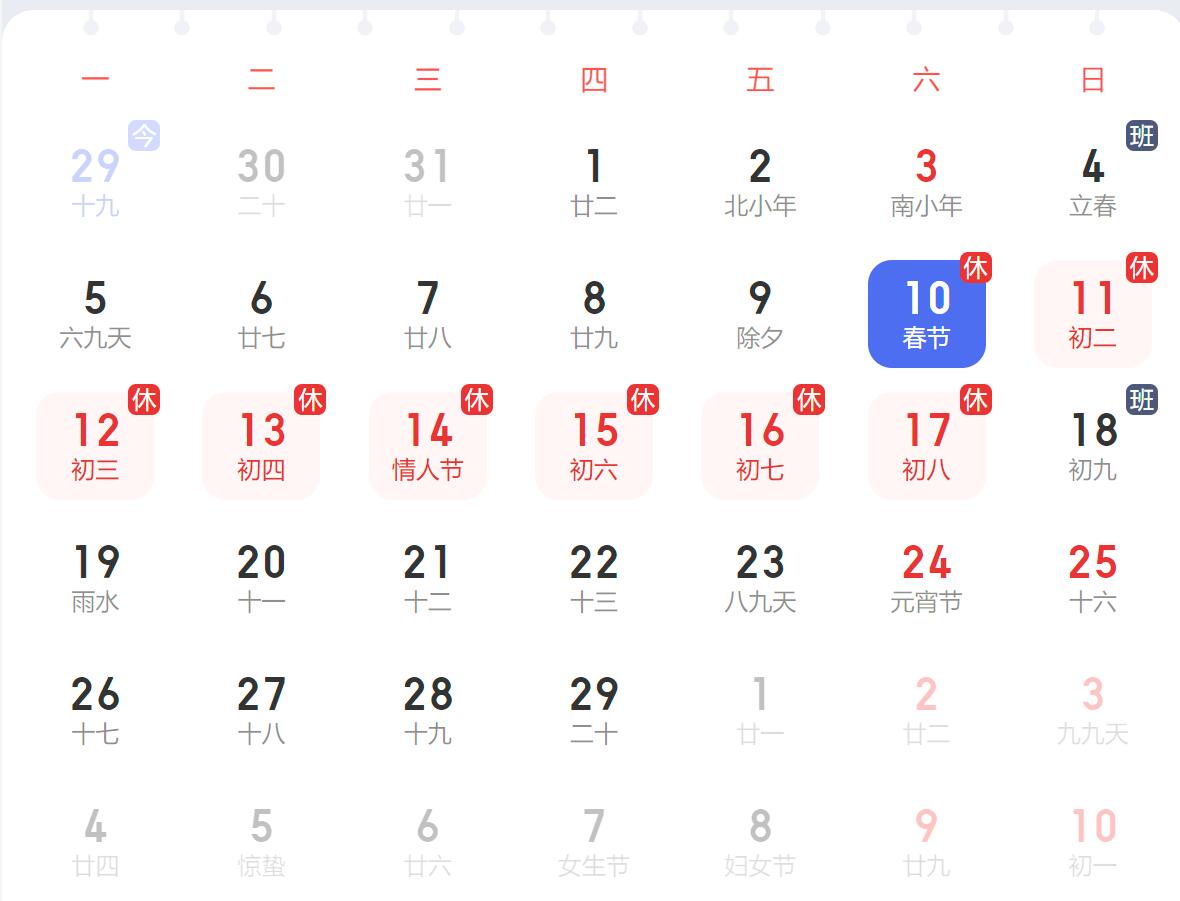 2月10日至17日放假調(diào)休,共8天。2月4日(星期日)、2月18日(星期日)上班。